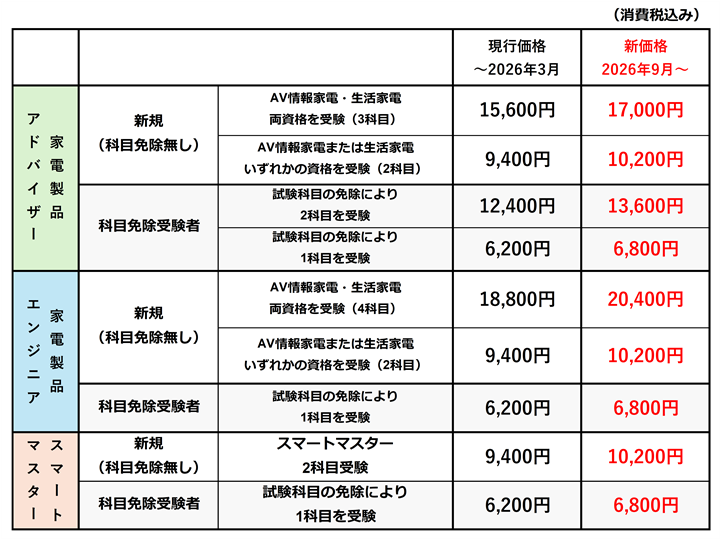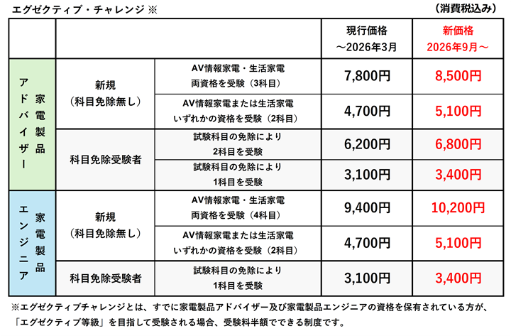 - エグゼクティブ・チャレンジ(すでに家電製品アドバイザー及び家電製品エンジニアの資格を保有されている方が、「エグゼクティブ等級」を目指して受験される場合、受験料半額でチャレンジできる制度)は継続いたします。(詳細後述)