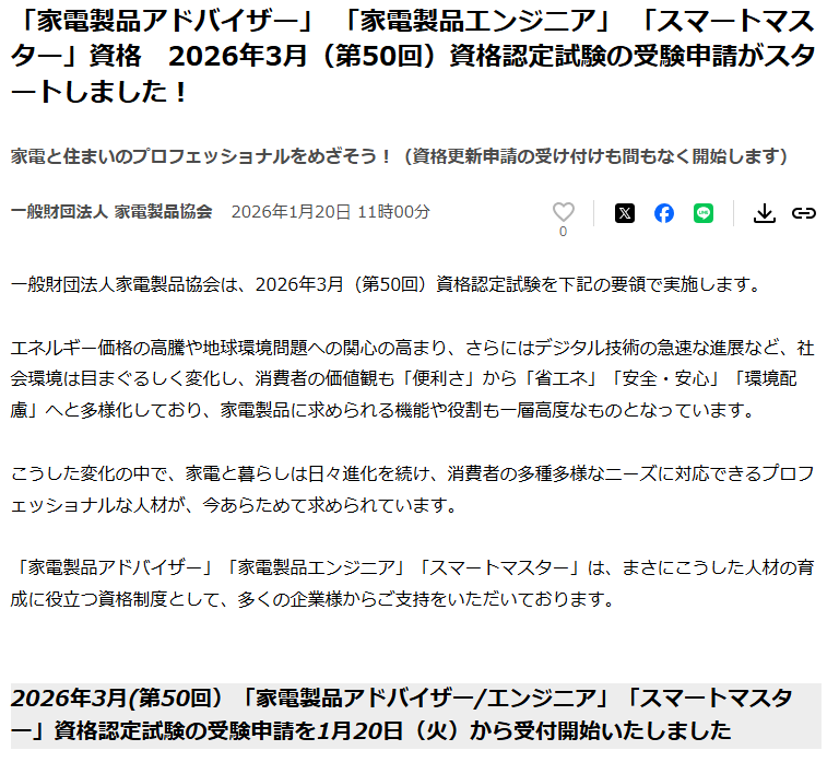 「2026年3月(第50回)資格認定試験」に関して、ニュースリリースを配信しました
