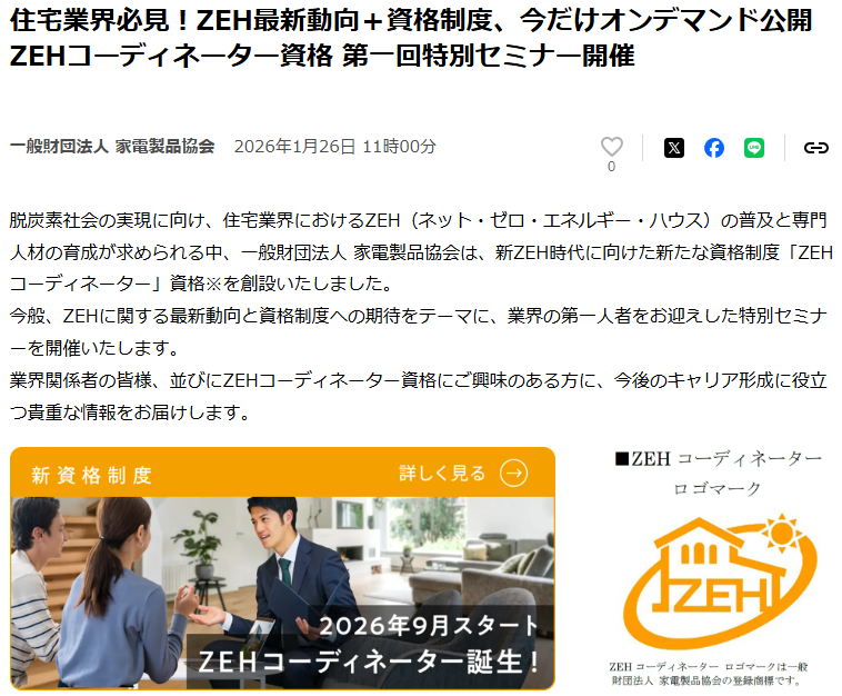 2026/01/27 トピックス 「ZEHコーディネーター資格 第一回特別セミナー開催」に関して、ニュースリリースを配信しました 多数のニュースメディアに掲載されておりますのでご一読ください。掲載記事はこちらから