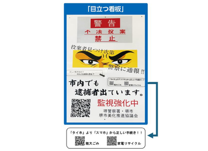 大阪府堺市が設置した看板は、「不法投棄の禁止」だけでなく、正しい処分方法を伝える「QRコードを掲載」することで、どう処分したらよいか分からない人への啓発を行うことで、不法投棄を未然に防止する効果に繋がっています。